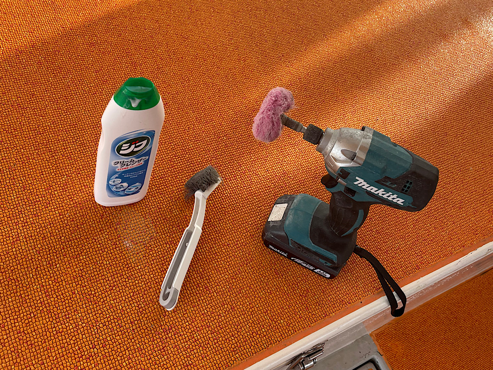 写真②お掃除道具たち。2日目にしてたわしがへたれて来てる。頑張ってる証拠!